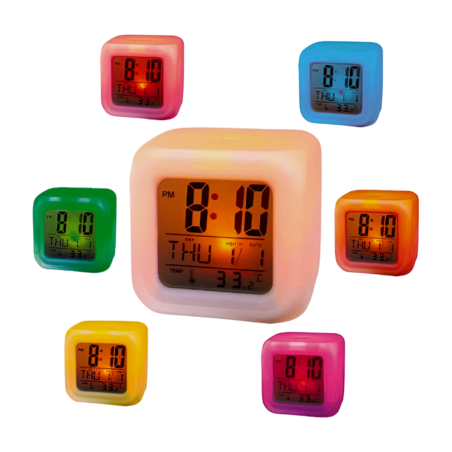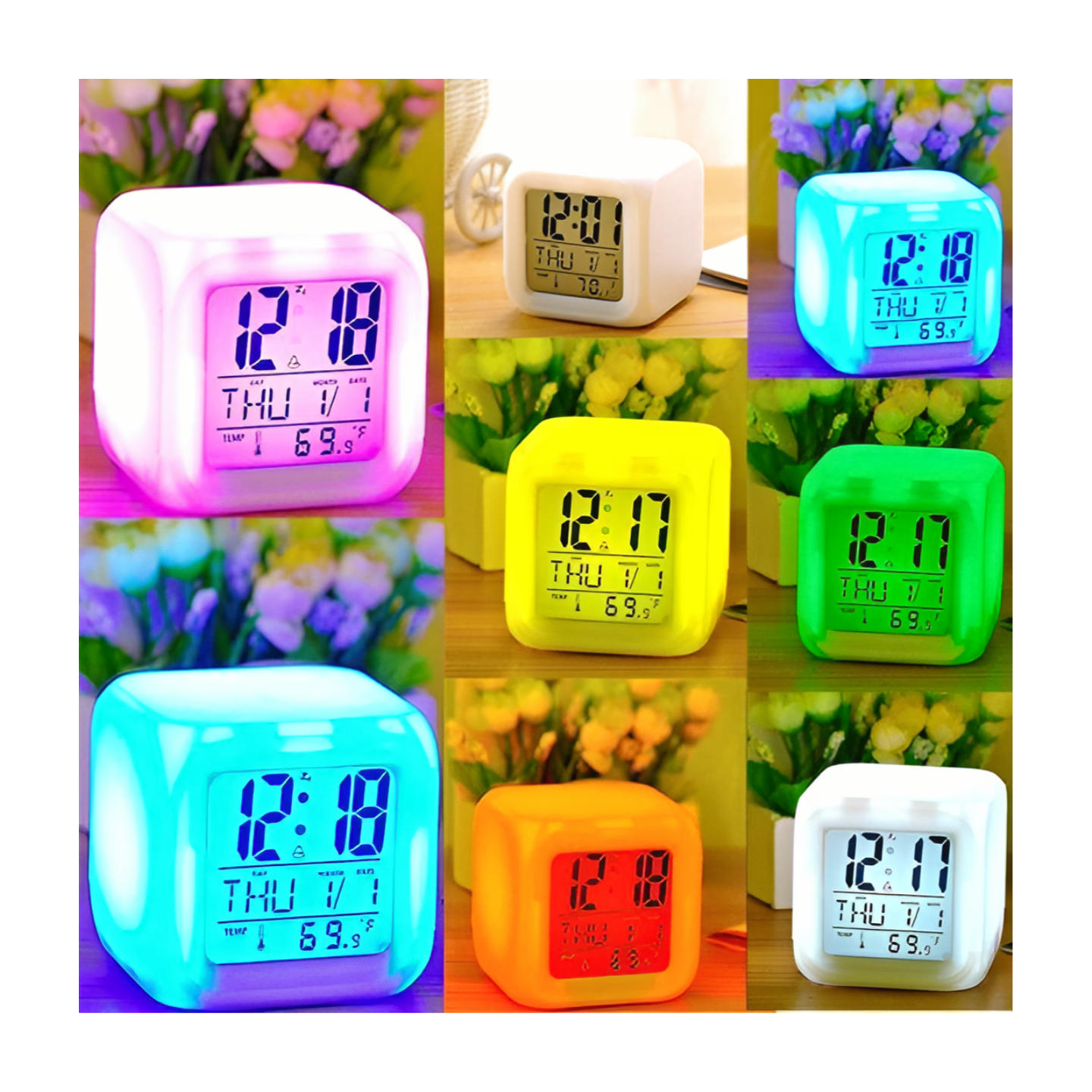 De wekker toont de tijd, kamertemperatuur in C of F, datum, weekdag en wordt gevoed door 3 AAA-batterijen (niet inbegrepen). De led verlichting heeft 7 verschillende kleurmogelijkheden die op elk moment veranderd kan worden naar voorkeur.