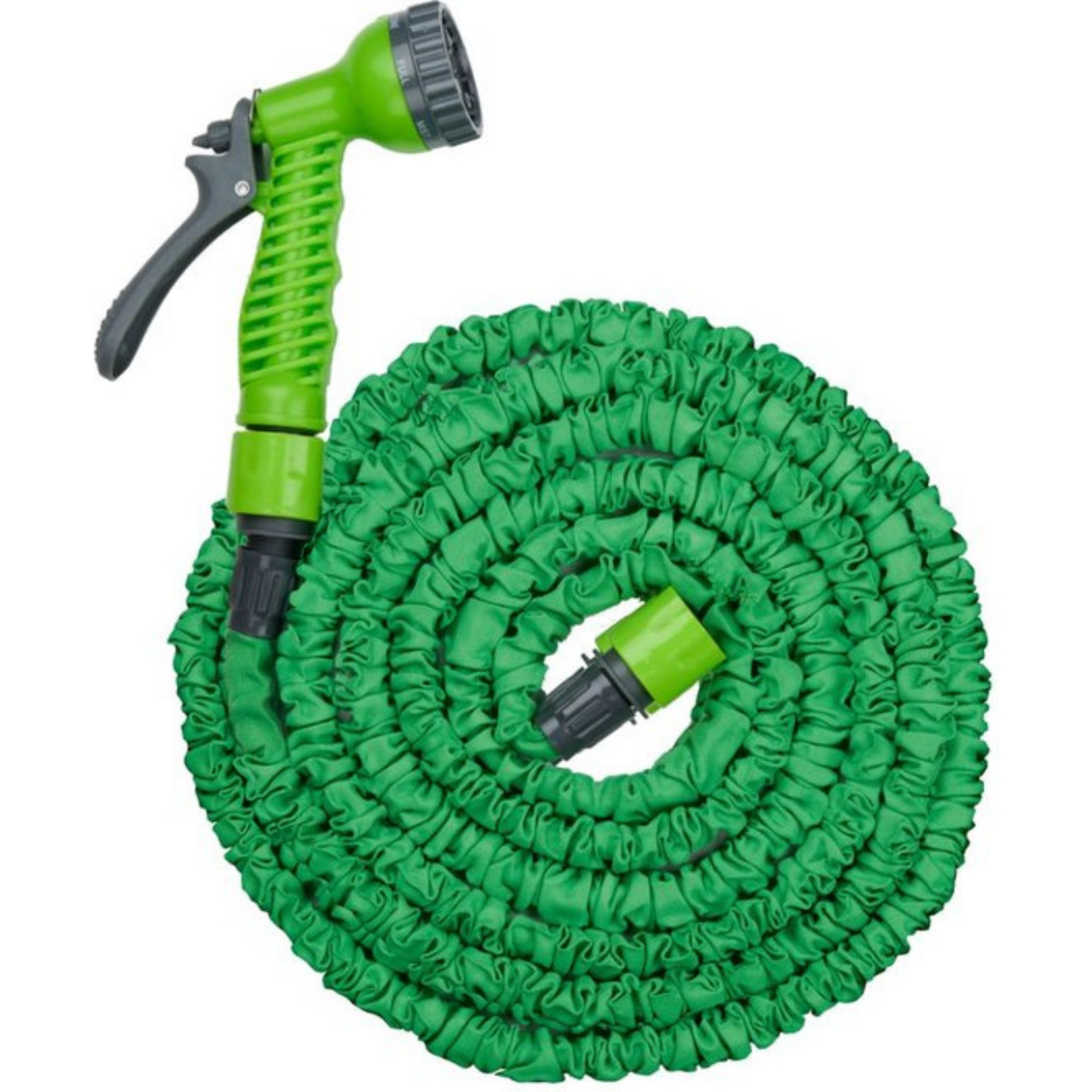 Deze flexibele tuinslang set met opzetstuk is ideaal voor het onderhouden en besproeien van je tuin. De set wordt geleverd met een flexibele tuinslang. Deze heeft een lengte van 5 meter en is uitrekbaar tot en maximale lengte van maar liefst 10 meter. Zo heb je meer bewegingsvrijheid dan bij een traditionele tuinslang. Hierdoor neemt de tuinslang ook minder ruimte in beslag wanneer hij niet in gebruik is. Tot slot worden er nog een sproeikop en een koppelstuk meegeleverd. De sproeikop beschikt over 7 spraystanden variërend van een harde waterstraal tot een zachte mist.