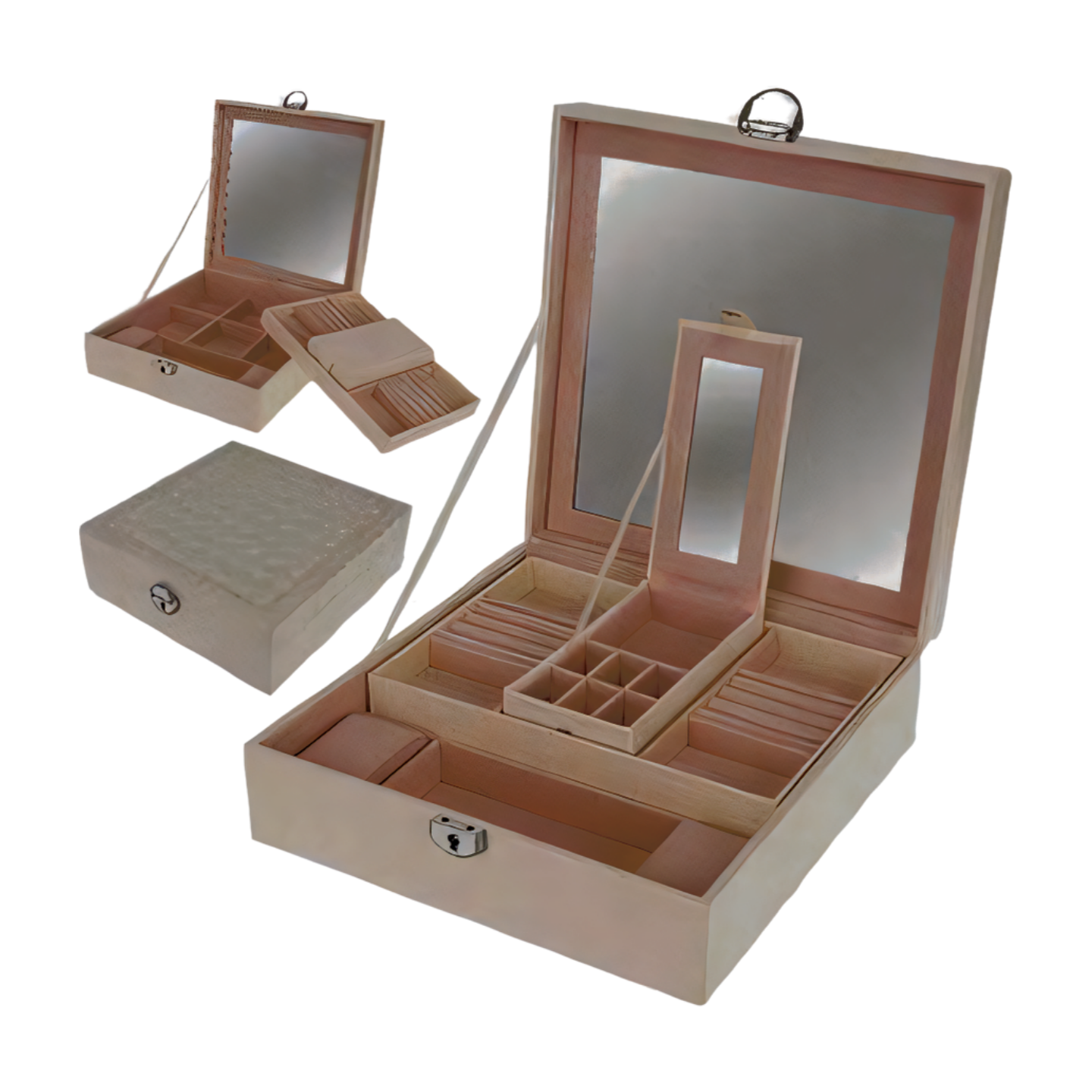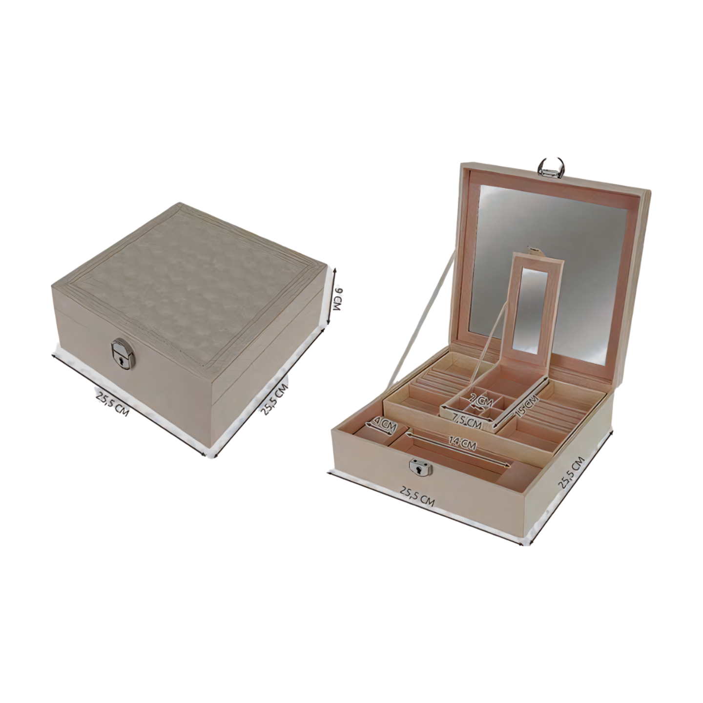 VERWIJDERBARE REISCASSETTE - op het eerste niveau is er een verwijderbare koffer gesloten met een vergrendeling. Het heeft 6 kleinere stoelen en 1 grote. Perfect om een paar kettingen, oorbellen, ringen of armbanden mee op reis te nemen. Hij past gemakkelijk in elke tas / toilettas en heeft hem altijd bij je. SPIEGEL - in de kofferbak bevindt zich een kantelbare spiegel. Perfect voor het aanbrengen van sieraden en voor het aanbrengen van make-up. Onder de spiegel bevindt zich een opbergdoos waarin u uw meest waardevolle sieraden kunt opbergen.
