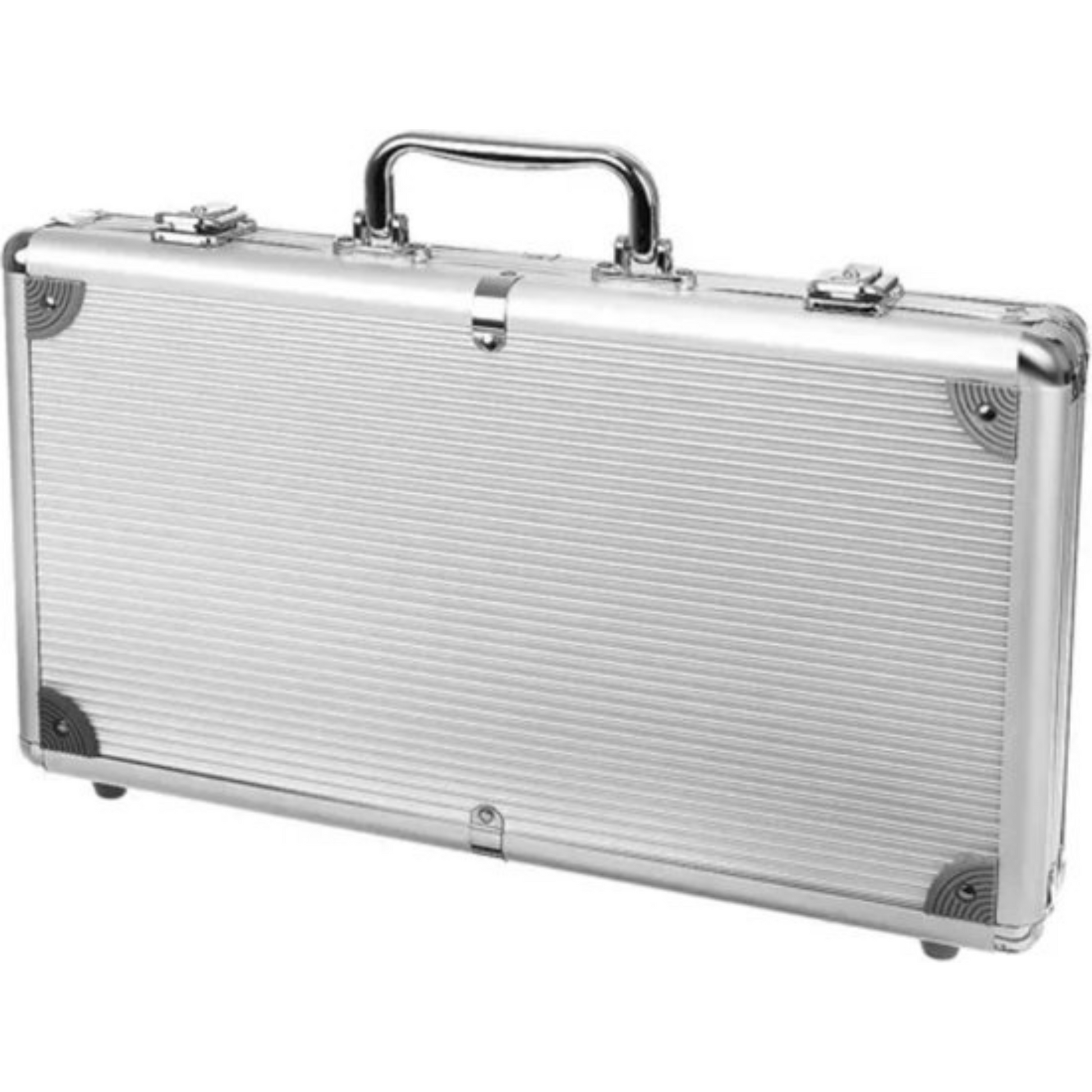Deze uitgebreide set bevat 2 decks van 54 speelkaarten, 5 dobbelstenen, en 3 functionele chips (dealer, small blind, big blind) voor een gestroomlijnde spelervaring. Alles is opgeborgen in een robuuste, aluminium koffer met een stevig slot.