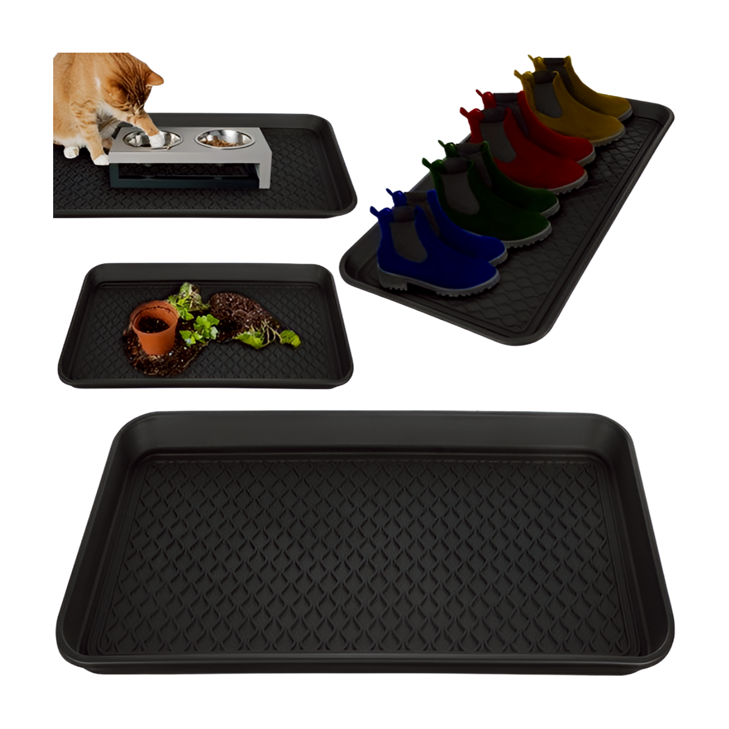 Multifunctioneel De mat is niet alleen perfect voor schoenen. Je kunt het ook gebruiken voor het bewaren van kamerplanten, als onderzetter voor huisdierenvoerbakken, voor bescherming van de kofferbak, of zelfs als druppelbak voor conserven of schoonmaakmiddelen.