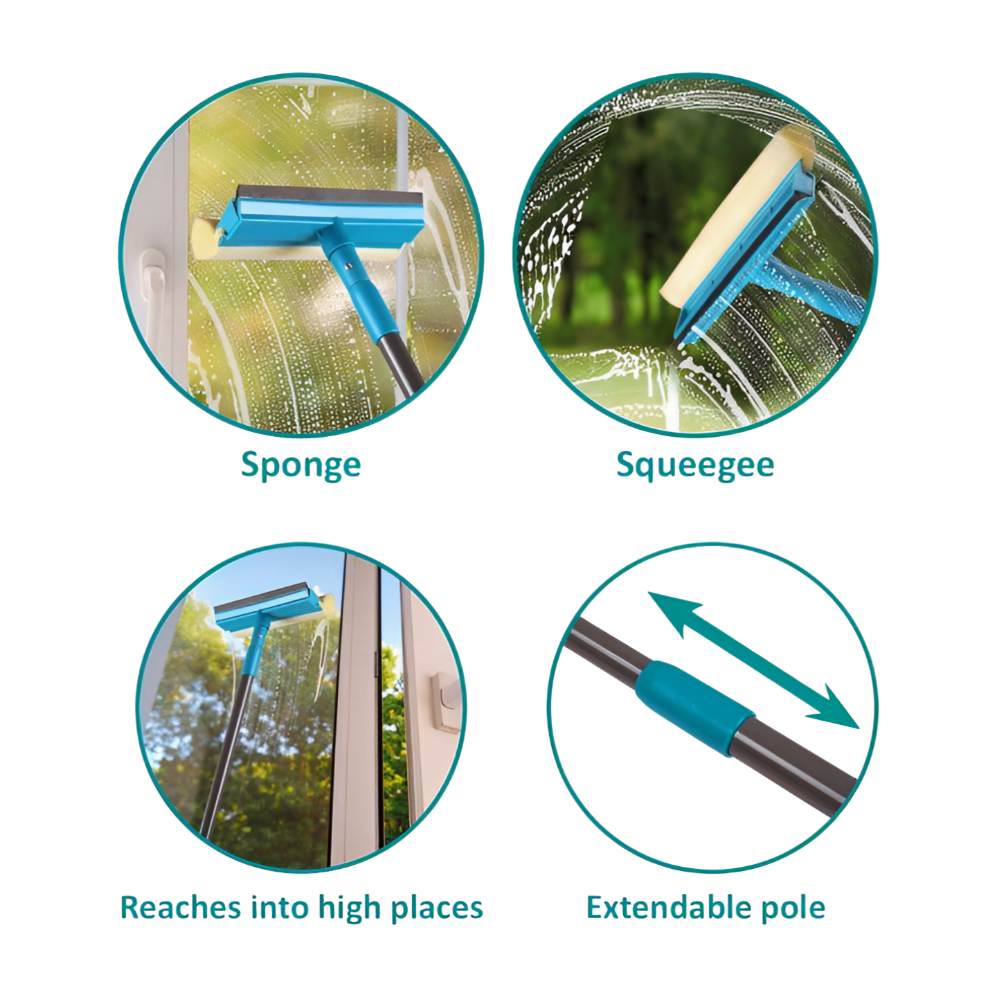 2 in 1 telescoopsteel ramenwasser voor het wassen van uw ramen. Door middel van de uitschuifbare steel kunt u gemakkelijk op hoogte uw ramen wassen. Ook geschikt voor het wassen van uw autoruiten. De afmetingen van de telescopisch steel zijn minimaal 55 cm en maximaal 95 cm. De spons en trekker hebben een afmeting van 20 cm. Ideaal voor het wassen van kleine raampjes op hoogte. De ramenwisser is een lichtgewicht in zijn klasse waardoor u gemakkelijk boven uw hoofd kunt zemen.