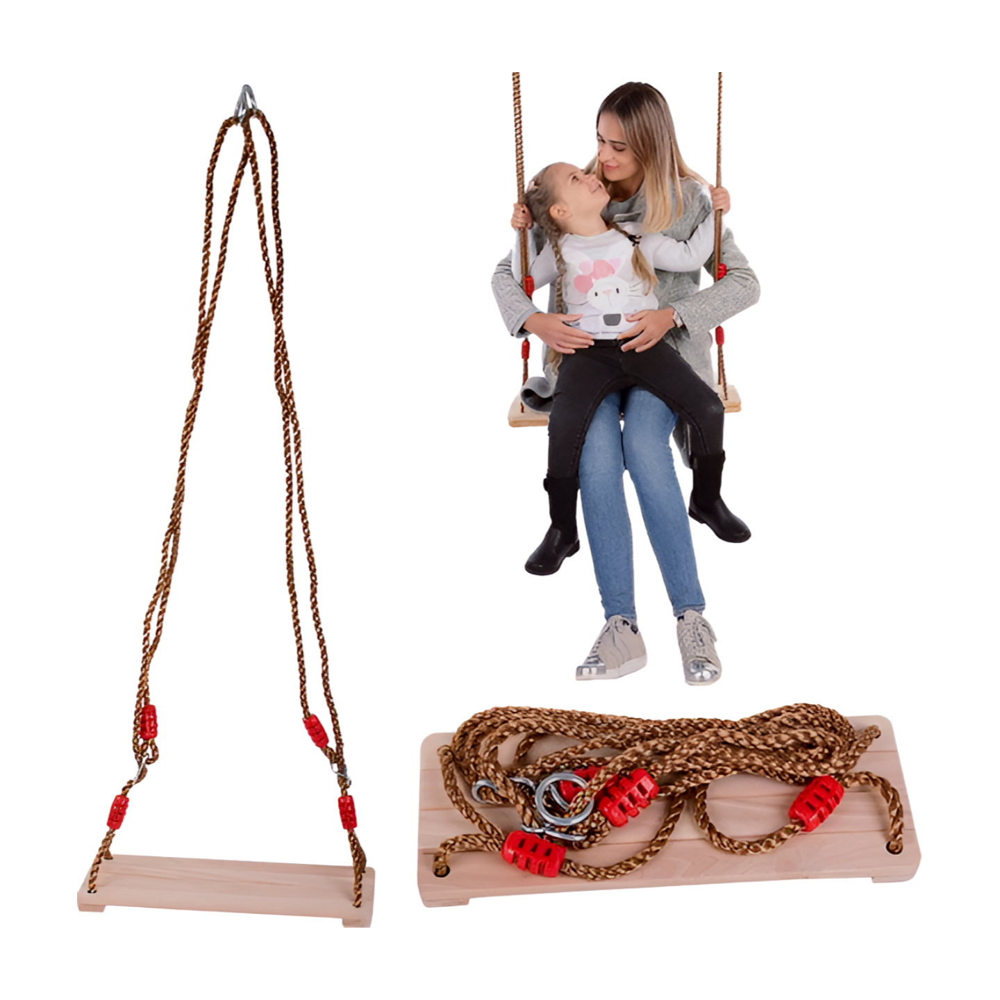 Houten schommel / kinderschommel met touwen en bevestigingsringen. Formaat zitplank: ca. 40 x 16 cm. Materiaal: dennenhout. De touwen zijn in hoogte verstelbaar. Maximale draagkracht: 100 kg.
